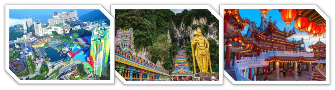- Cao nguyên Genting - Tự do tham quan và mua sắm, đây là trung tâm phức hợp lớn nhất của Malaysia cách thủ đô 51 km, ở độ cao 1.800m so với mặt nước biển. (Không bao gồm vé trò chơi). Đoàn di chuyển bằng cáp treo từng đạt kỷ lục dài nhất Đông Nam Á với 3,3 km - lý thú khi những chiếc cabin được lẩn khuất trong mây (tùy điều kiện thời tiết. Hoặc sẽ di chuyển bằng xe).