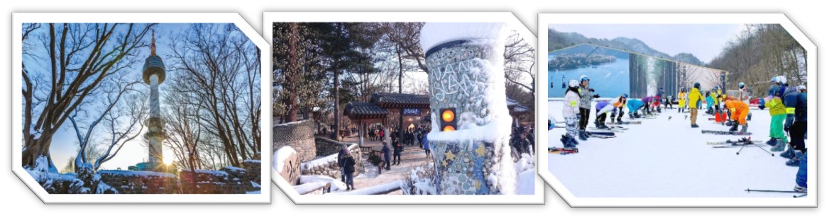 - Đảo Nami – Nổi tiếng với những bản màu sắc riêng theo từng mùa: Mùa thu rực rỡ ánh vàng đỏ của tán cây phong và rừng ngân hạnh; Mùa hè có cây cối mướt xanh; Mùa đông huyền ảo với tuyết phủ trắng xóa& cuối cùng đặc biệt là vào Mùa xuân hàng trăm cây hoa anh đào nhuộm sắc hồng rực rỡ, với mùi hương ngọt ngào phảng phất không khí và lànơi ra đời của nhiều bộ phim truyền hình nổi tiếng của Hàn Quốc đã làm dấy lên cơn sốt nghệ thuật thứ bảy tại các nước CHÂU Á và thế giới như: "Bản Tình Ca Mùa Đông".